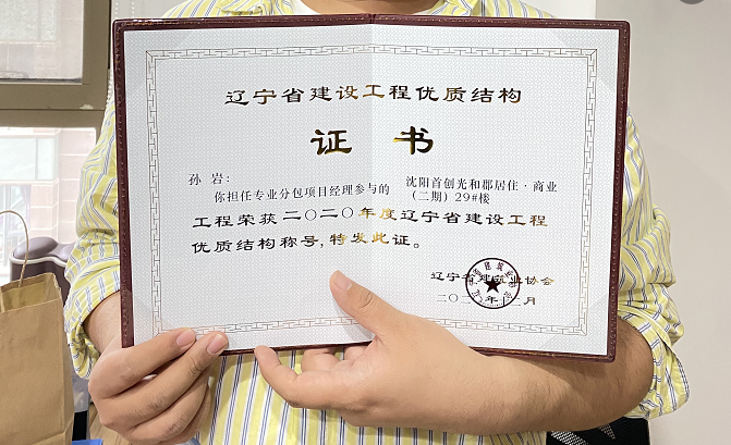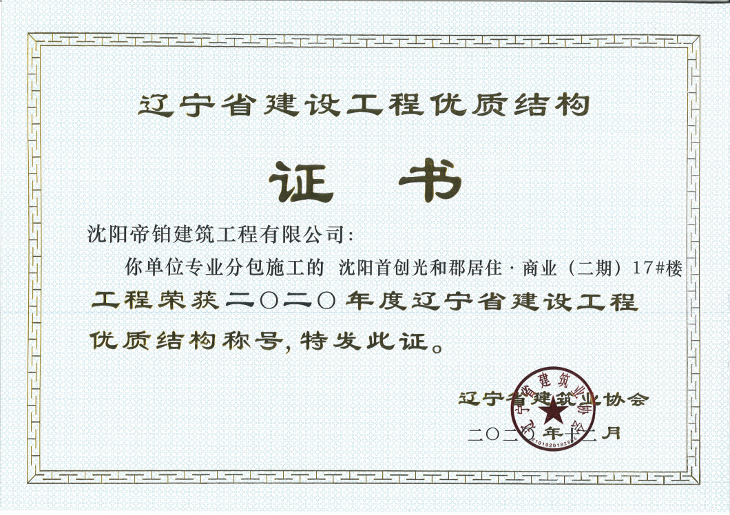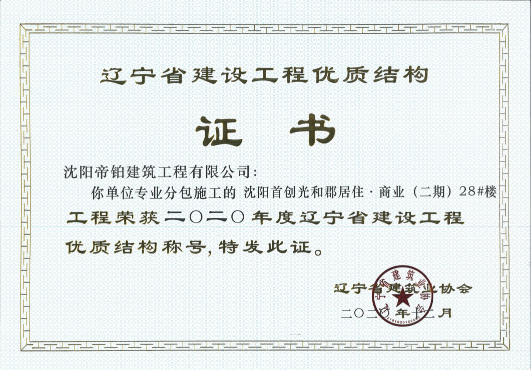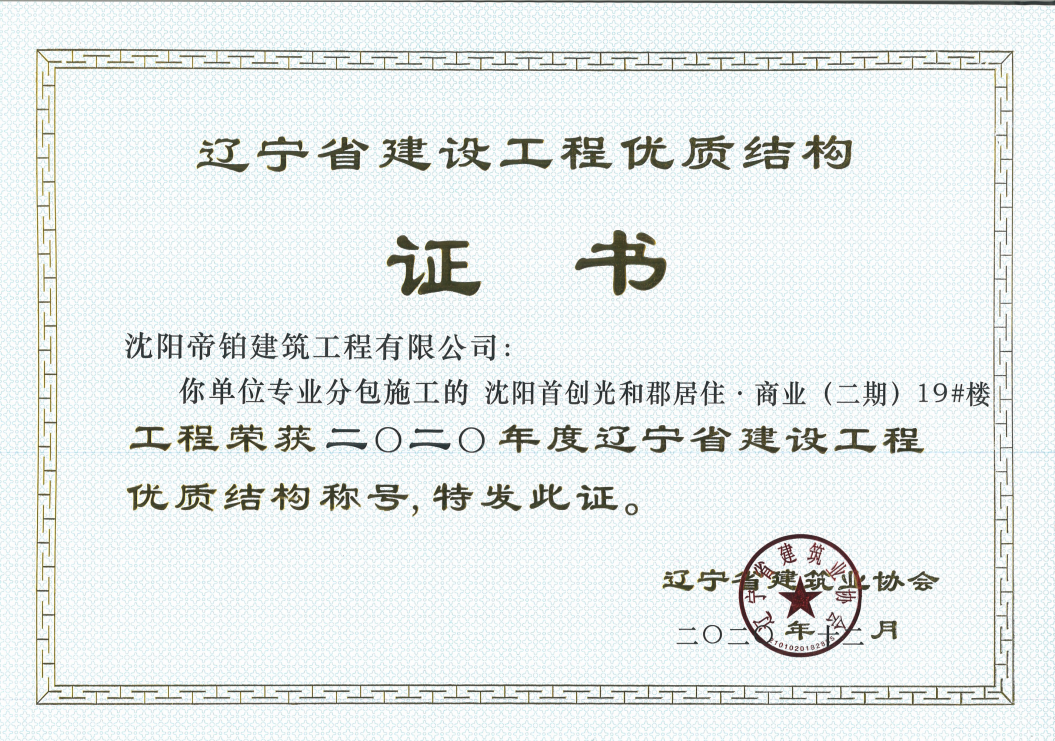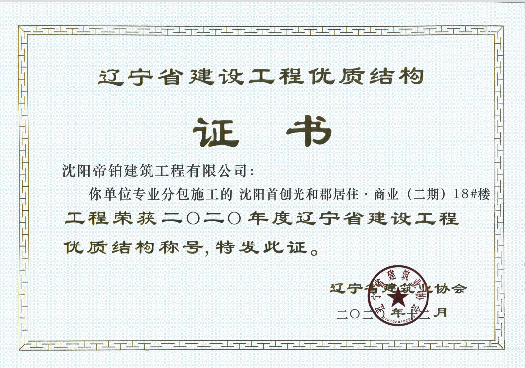 為弘揚(yáng)精益求精、追求卓越的工匠精神,充分發(fā)揮榜樣引領(lǐng)、示范作用,遼寧省建筑業(yè)協(xié)會(huì)對(duì)建設(shè)工程進(jìn)行了評(píng)選,最終由省建設(shè)工程質(zhì)量評(píng)審委員會(huì)組織認(rèn)定:沈陽(yáng)帝鉑建筑工程有限公司(以下簡(jiǎn)稱(chēng)帝鉑)承建的“李石河西4#地塊一期G3#樓”、“沈陽(yáng)首創(chuàng)光和郡居住·商業(yè)(二期)17#”、“沈陽(yáng)首創(chuàng)光和郡居住·商業(yè)(二期)18#”等9項(xiàng)單位工程榮獲【2020年度遼寧省建設(shè)工程優(yōu)質(zhì)結(jié)構(gòu)獎(jiǎng)】;帝鉑人員孫康、李洋、王言、楊世權(quán)、孫巖等24人獲得【2020年度遼寧省建設(shè)工程優(yōu)質(zhì)結(jié)構(gòu)獎(jiǎng)參建人員】的榮譽(yù)證書(shū),這也是帝鉑自成立以來(lái)第二次獲此殊榮。