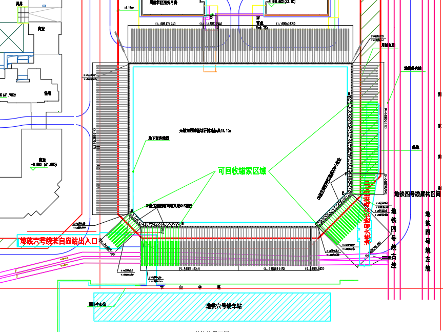 設(shè)計情況:基坑深度暫定約為15.5m,基坑安全等級為一級;基坑?xùn)|側(cè)臨地鐵四號線,且支護(hù)樁與地鐵四號線間有規(guī)劃地鐵六號線出入口,基坑南臨規(guī)劃六號線車站,西南角有規(guī)劃地鐵六號線出入口?;诱w采用混凝土支護(hù)樁+錨索支護(hù)體系,支護(hù)樁直徑600mm、樁間距1.2m,東側(cè)和西南角采用可回收錨索。