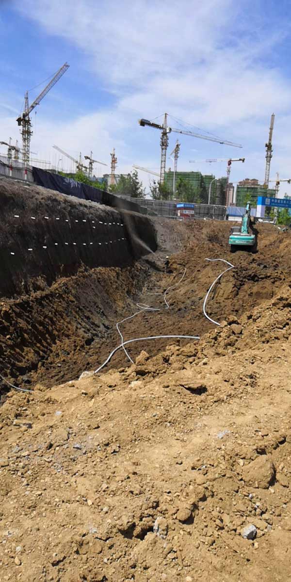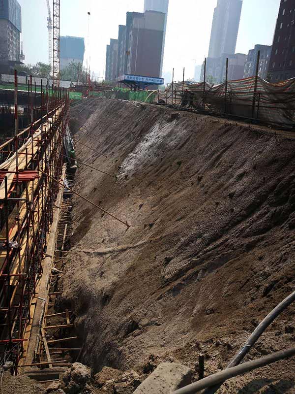 本次基坑支護施工是二期部分高層及地下停車場。采用樁錨+放坡素噴混凝土的支護體系,鋼管樁樁長9.0m,樁間距0.5m,兩排錨索,錨索間距為1.2m。