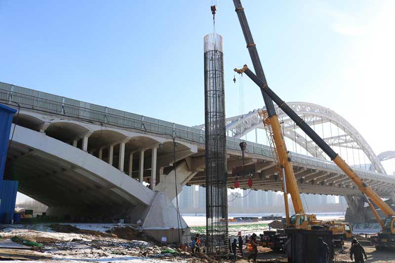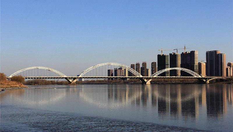 渾河長青大橋位于沈陽市東南部,橋梁由主橋和南北引橋組成,主橋?yàn)槿字谐惺戒摴芑炷凉皹颍瑑艨鐝?27.226m+147.992m+127.226m,南北引橋各為 60.95+52.502m 的空腹式鋼筋混凝土拱肋橋,橋梁全長 629.348m。該項(xiàng)目的維修改造工程主要包括兩側(cè)新建橋梁和舊橋的加固維修。在舊橋左右兩側(cè)新建同跨度橋梁各一幅,橋梁每幅橋?qū)捑鶠?4.5m,跨徑布置為51.85+52.502+127.226+147.992+127.226+52.502+51.85=611.448m。