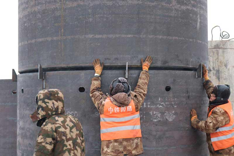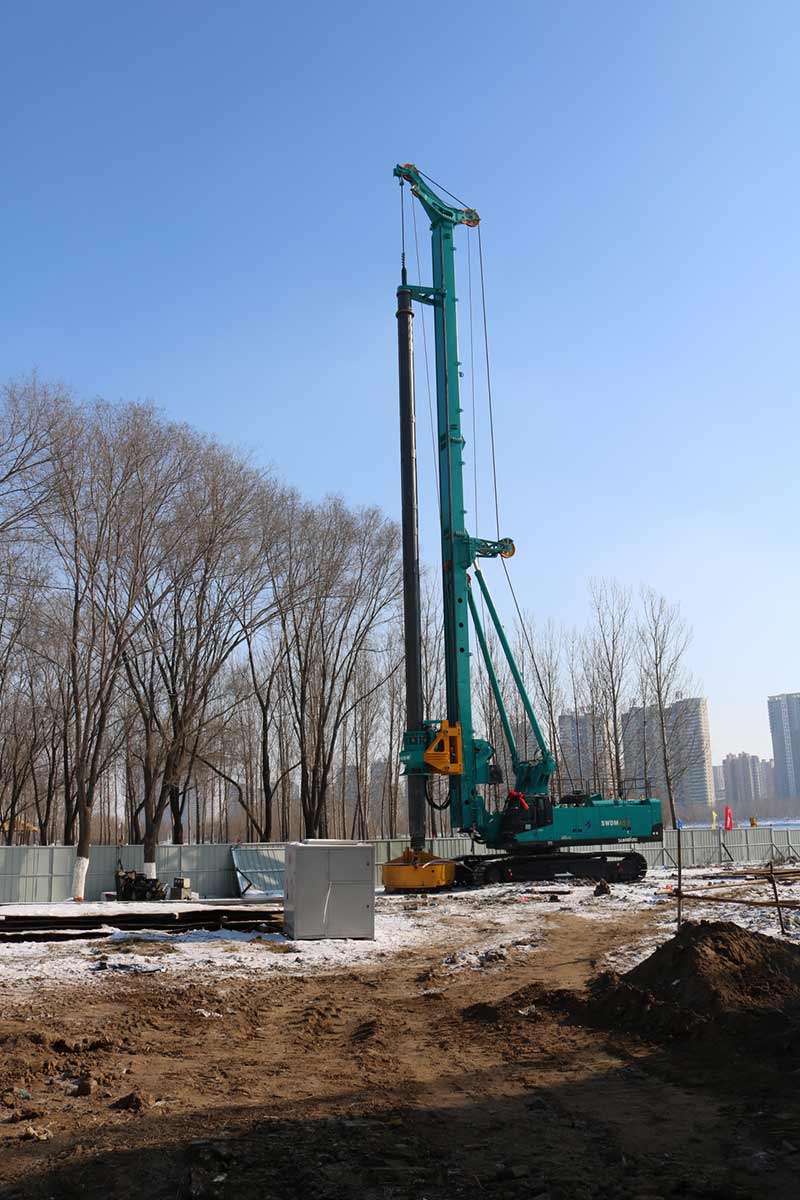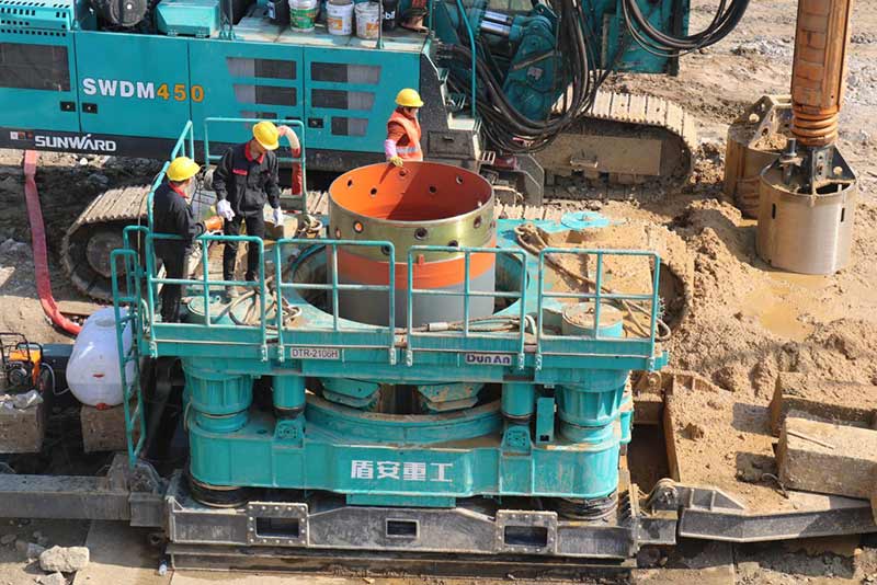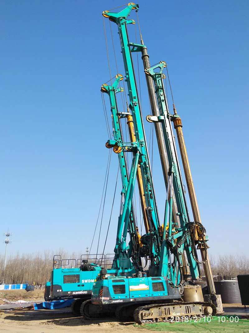新建東側(cè)橋梁75、76承臺樁基礎(chǔ)施工前采用旋噴加固處理,旋噴樁最大深度為48米,已超過旋噴鉆機(jī)成孔極限,采用百米鉆機(jī)引孔,安放PVC塑料管,引孔完成后進(jìn)行旋噴。旋噴完成后旋挖采用擴(kuò)孔鉆頭擴(kuò)孔安放長鋼護(hù)筒。