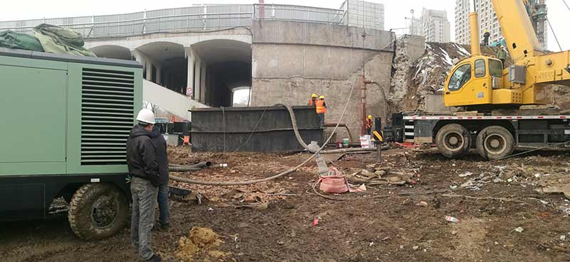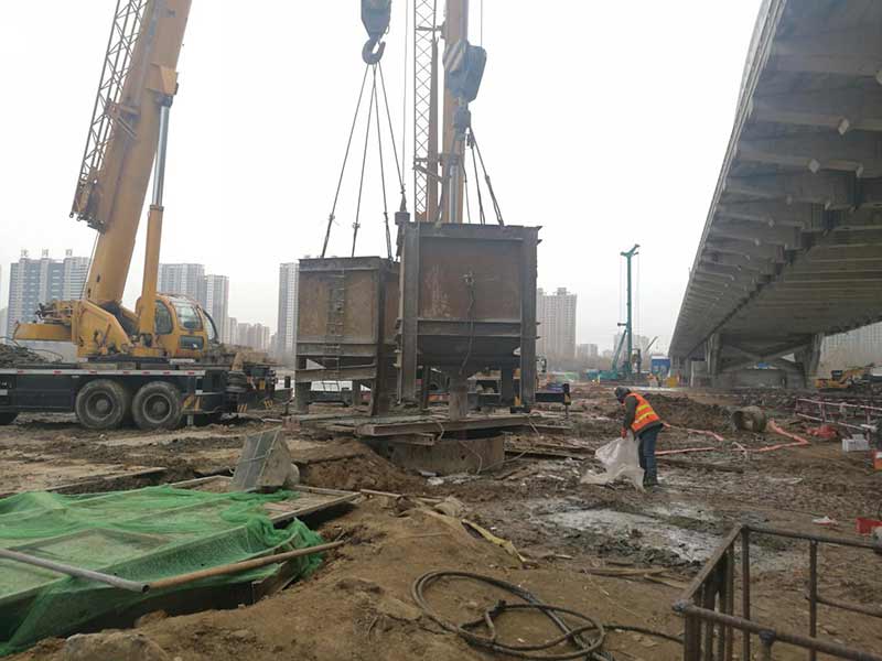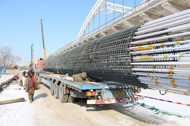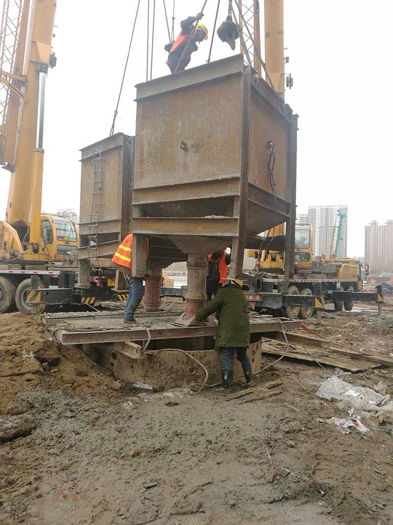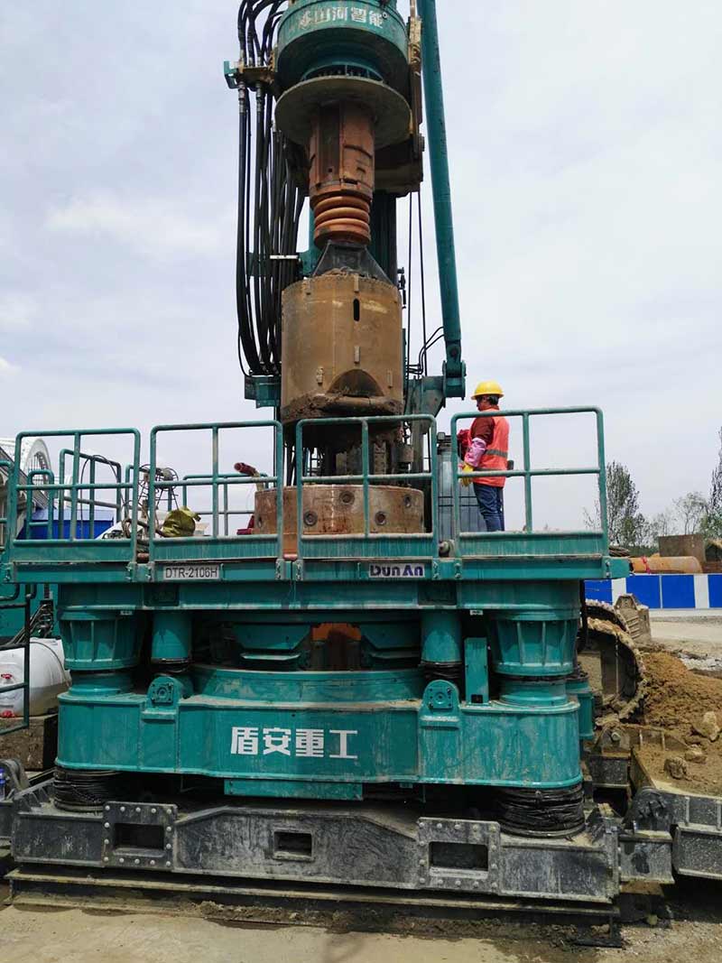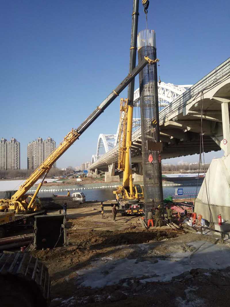 長青橋新建橋梁位于長青橋兩側(cè),西側(cè)樁型為摩擦樁,東側(cè)樁型為端承樁;樁基礎(chǔ)采取大直徑混凝土水下灌注樁,西側(cè)樁徑為Ф2m,東側(cè)樁徑為Ф1.5m、Ф2m、Ф2.5m、Ф2.8m,共計(jì)55根,Ф2.5m樁最深鉆孔深度達(dá)73.8m,進(jìn)入中風(fēng)化5m,Ф2.8m樁最深鉆孔深度達(dá)71.5m,進(jìn)入中風(fēng)化5.6m;其中,72#、73#、74#、75承臺在渾河中,71#、76#、77#在河岸上;東側(cè)新建橋梁距地鐵較近,為保證施工安全,在距離地鐵10號線較近處的樁采取安放鋼護(hù)筒至泥礫2.5m的保護(hù)措施,Ф2.5m,Ф2.8m樁最深鋼護(hù)筒埋設(shè)至44m,其中77臺Ф1.5m樁首次采用全回轉(zhuǎn)鉆機(jī)埋設(shè)護(hù)筒,護(hù)筒最深埋設(shè)至52m。二次清孔方式采用氣舉反循環(huán)清孔。Ф2.5m、Ф2.8m樁采用雙導(dǎo)管灌注,首灌使用2個5.7m³大料斗封底,